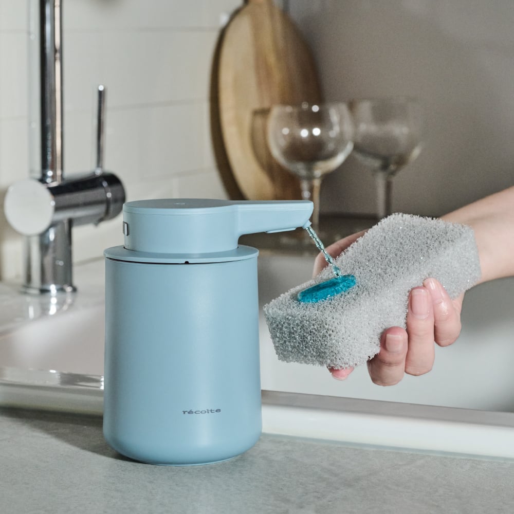 手をかざすだけでハンドソープや食器用洗剤が自動で出る、オートタイプの液体ハンドソープディスペンサー。手をふれずに使えるから洗い物も簡単。手がふさがりがちなキッチンで使うと便利です。