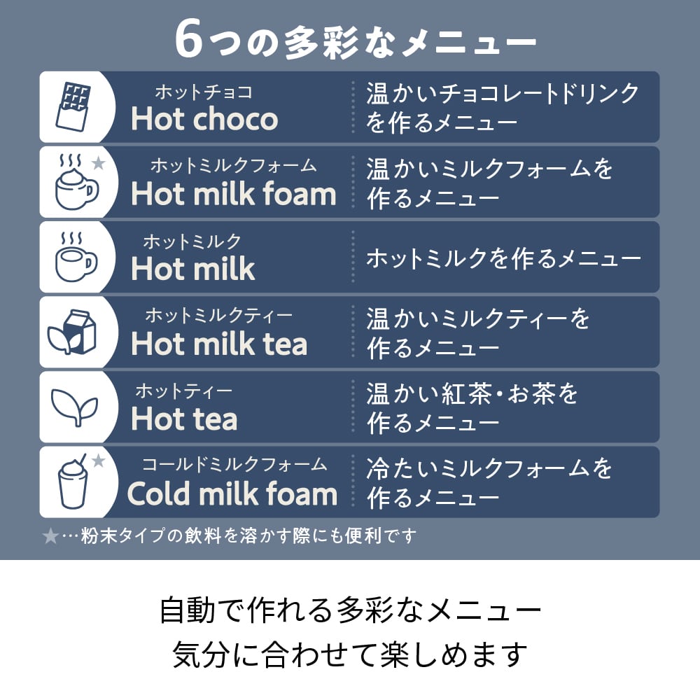 チョコレートドリンクやミルクフォームに加え、【Hot tea】や【Cold milk foam】など、6つのメニューから選ぶだけで簡単に作れるので、気分に合わせて多彩なドリンクを楽しめます。