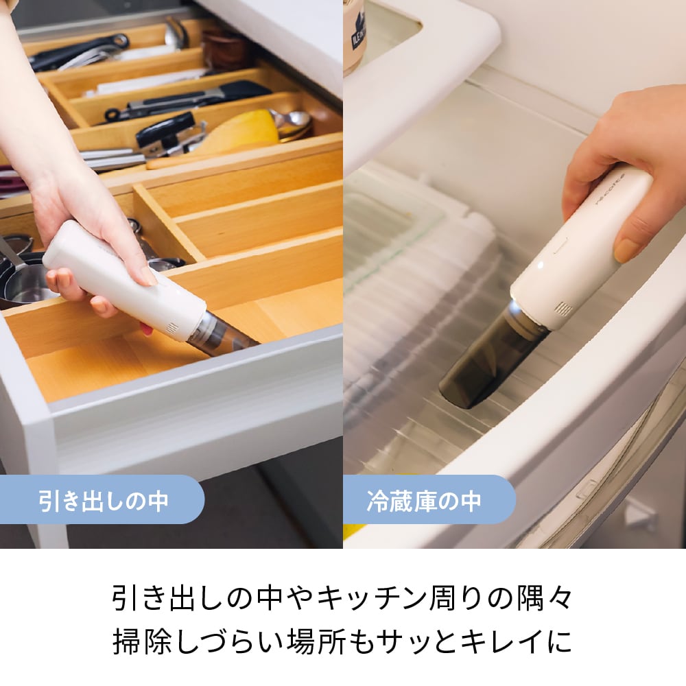 食卓・デスクはもちろん、冷蔵庫の中、靴箱、家具のすき間など、スティック掃除機では届きにくい場所にもぴったり。