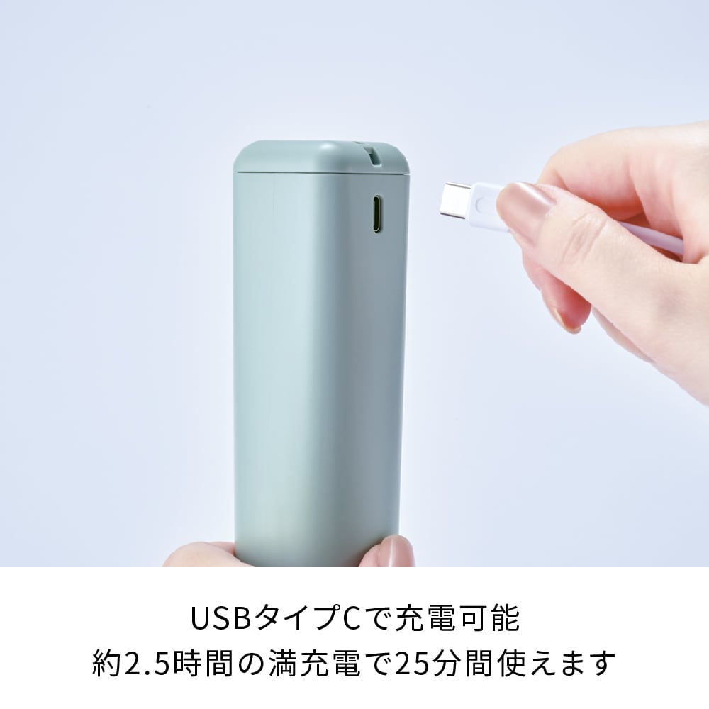 約2.5時間の充電で、25分の連続稼働が可能です。充電口は汎用性の高いUSBタイプC。