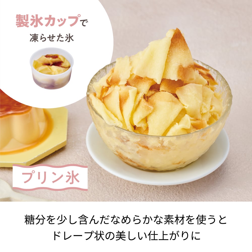 付属の製氷カップを使えば、水氷だけでなく、牛乳やプリンを凍らせた“デザートかき氷”も簡単に。