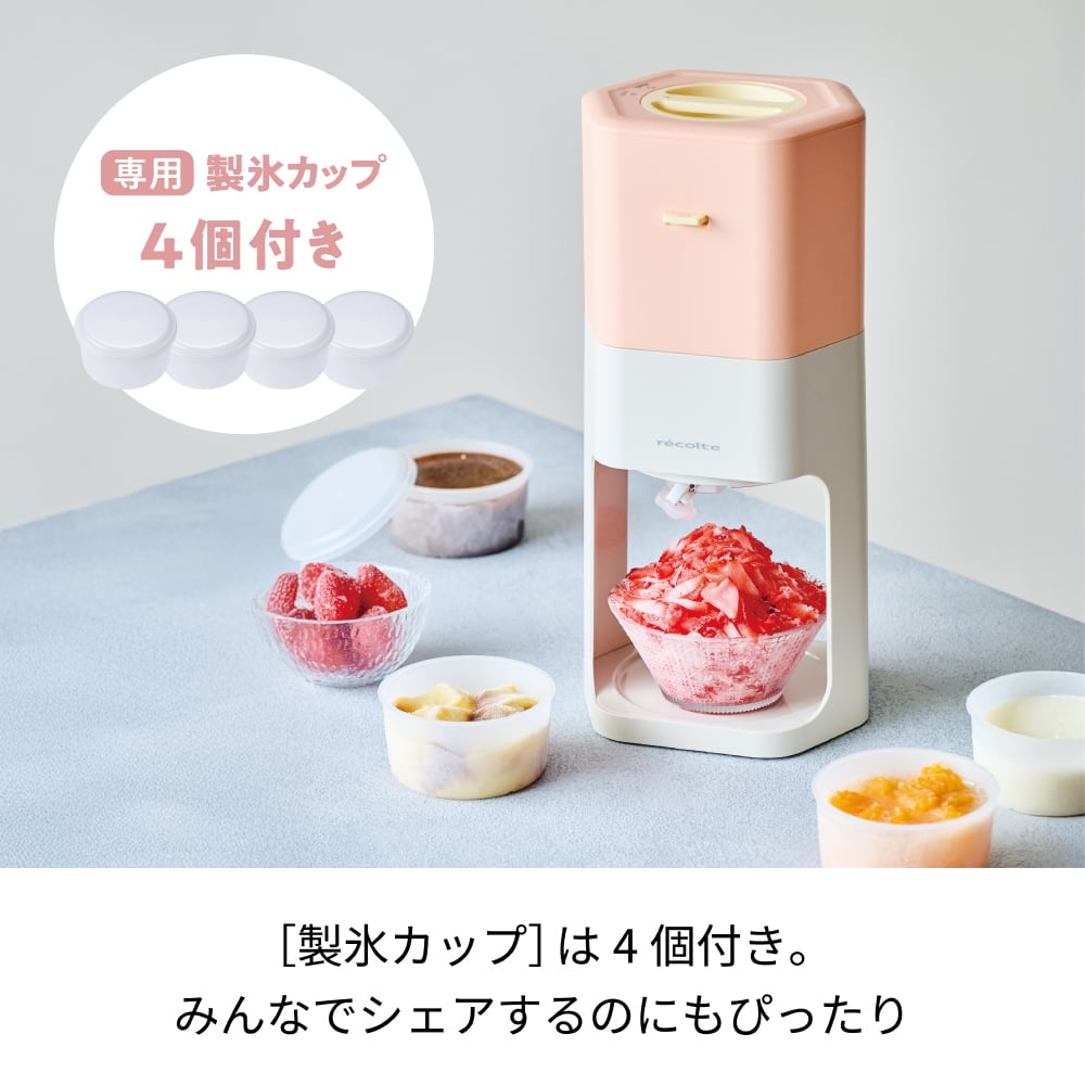 製氷カップは4個付属。いちご・マンゴー・ミルクなど、異なる味を同時に仕込めるので、家族や友人とシェアするのにもぴったりです。